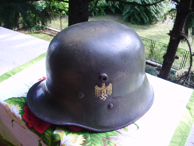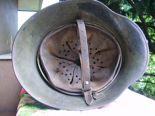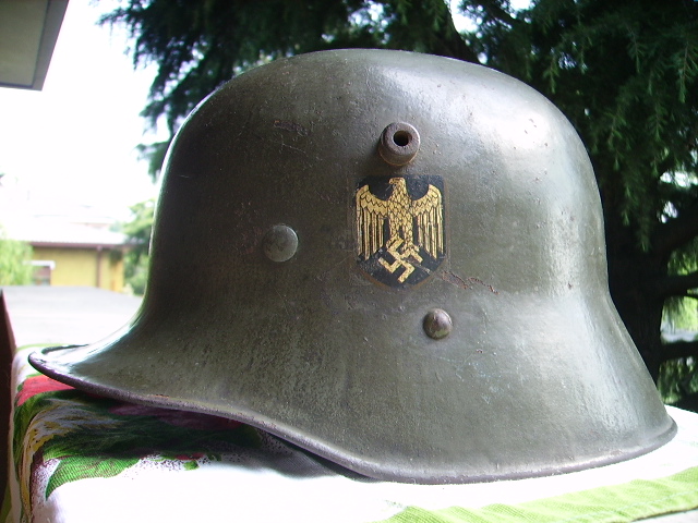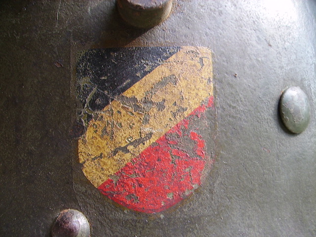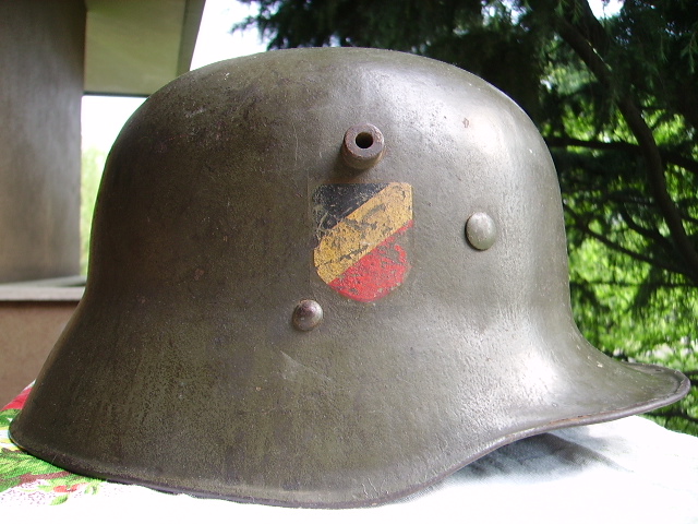 Posto un elmetto 1a guerra austriaco con vernice verde liscia riutilizzato durante la 2a tramite l'installazione del nuovo interno M31 con banda in alluminio rinforzato e l'applicazione delle 2 decals tipiche dei modelli m35 (aquila e tricolore). Pezzo davvero intonso con molta buona patina. Interessante il collante che si vede tutto intorno alla aquila e che ha assunto un colore marrone scuro per effetto della ossidazione.