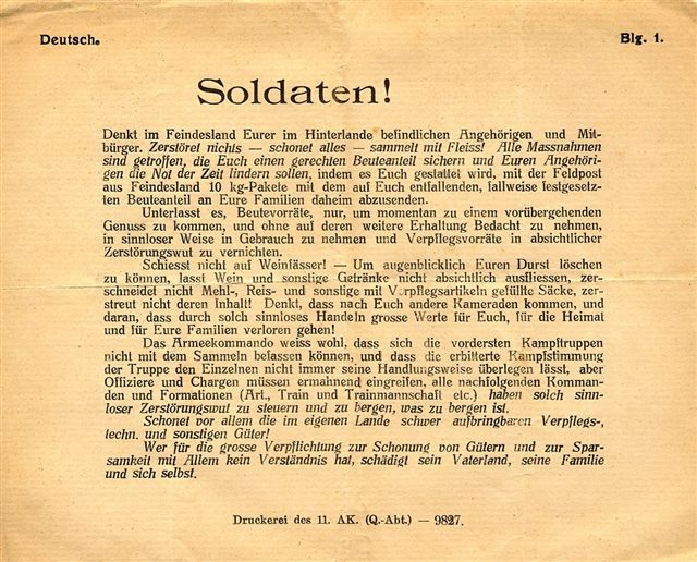 Il nemico tenta con bugiarde esagerazioni, con menzogne fantastiche, gettare lo sgomento tra voi per indebolire la resistenza alle spalle dell'esercito operante.