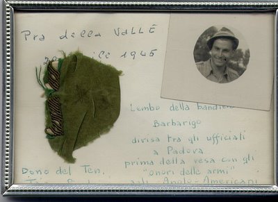 Era ormai l`imbrunire e c`invitò a riunire i nostri reparti in un prato vicino al ponte di Bassanello, in località* Pra` della Valle. Alle prime ore del mattino avremmo dovuto raggiungere Padova per la resa e per essere riconosciuti prigionieri di guerra alle dipendenze delle truppe inglesi. Il comandante Di Giacomo ci fece un commovente discorso e disse che quello non era 1`8 settembre, che la guerra era ormai finita per tutti, e di essere fieri di essere appartenuti alla Xa MAS. Finimmo con il grido "Decima marinai!", "Decima comandante!". Quella sera la Xa era "rientrata in porto" con l`onore delle armi. Fummo tutti presi da un`immensa tristezza. Ero assillato da un dubbio tremendo: secondo il codice d`onore militare esiste l`obbligo, sia per un soldato semplice che per un ufficiale, di non farsi prendere, quando é possibile, prigionieri. D`altra parte avevamo assicurato all`Ufficiale inglese che saremmo rimasti uniti e preparati per il giorno successivo per consegnarci ai comandi inglesi a Padova. Non sapevo come comportarmi. Del resto tutte le forze armate italiane si erano arrese, il governo italiano non esisteva più. Mussolini era stato fucilato. Se fossi scappato, dove sarei potuto andare a finire e cosa sarebbe successo ai miei Marò. Decisi di rimanere ed accettare quello che la sorte mi avrebbe prospettato. Non fu una notte felice. La 4a Compagnia aveva uno stendardo. Lo dividemmo in tanti pezzetti in modo da poterli distribuire ai centotrenta, centoquaranta superstiti. Sono riuscito a conservare quel pezzetto di stoffa, malgrado tutte le traversie subite durante il periodo di prigionia. Lo possiedo ancora e quando mi capita fra le mani, si scatena nella mia mente un fiume di ricordi che mi fanno domandare: "Se un giorno mi trovassi nelle stesse condizioni di allora, e senza le conoscenze di oggi, come mi comporterei?". La risposta é sempre la stessa; farei le stesse cose di allora. Sono certo che se avessi seguito un`altra condotta la mia coscienza ne sarebbe stata scossa.