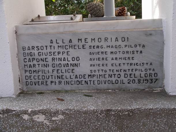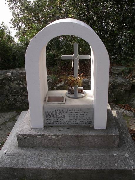 Ogni anno, in occasione delle commemorazione dei defunti, le autorità* locali depongono una corona d'alloro in questo luogo. Fra le autorità* è sempre presente una rappresentanza della vicina base dell'aeronautica di Cadimare (SP). Per sentito dire qui da sempre si è trattato di un incidente aereo che coinvolse un idrovolante di base appunto a Cadimare. Penso che loro possano esservi d'aiuto nella giusta individuazione del fatto.