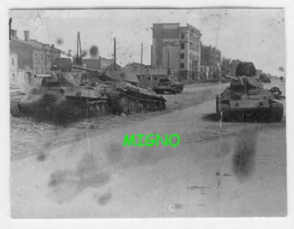 sempre in tema distruzione carri, una foto originale asportata da un album d'epoca. un mucchietto di T34 caduti in una qualche imboscata nelle vie di una città* di cui putroppo non so dire. Ci sono delle scritte al retro della foto ma sono coperte dai residui di colla e cartoncino dell'album.