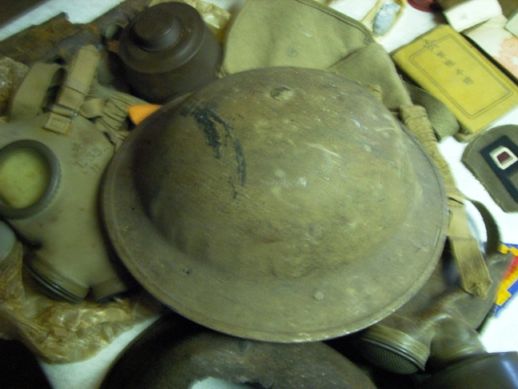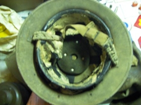 Questo MkI Inglese utilizzato nella WWI dagli Inglesi ed in seguito ceduto nel 1935/36 al Sud Africa e riutilizzato durante la WWII è in verità* molto malconcio.Infatti il liner si è "sciolto" ed il soldato l'ha foderato con giornali(che in alcuni punti sono ancora leggibili e che sono assolutamente d'epoca).Da notare che il soldato ha creato uno spessore con la carta di giornale per tenere fermo il liner.Sull'elmetto è stata incisa nella vernice la parola "Lemumba".Suppongo sia il nome del soldato.