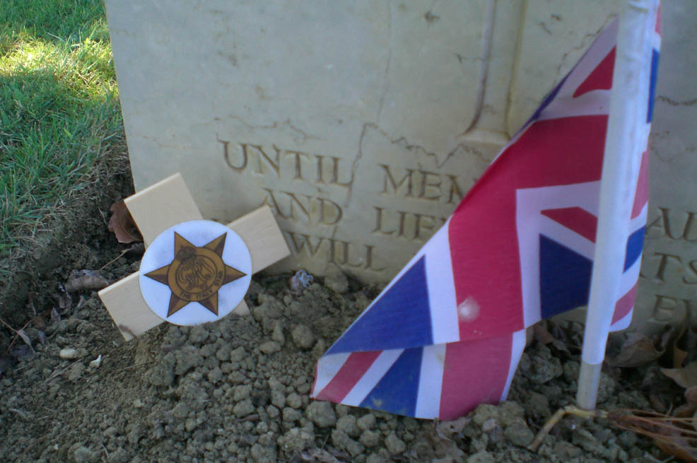 alcuni familiari in visita per omaggiare il suo riposo a distanza di 63 anni hanno posto una bandierina ed una croce di legno con al centro il disegno della di una decorazione ricevuta del soldato per la campagna d'italia