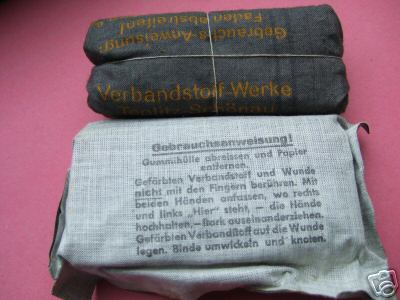 Posto di seguito un pacchetto di medicazione contenente cento garze pressate in dotazione(credo)agli assistenti di sanità* e due bendaggi individuali.Spero vi piacciano.