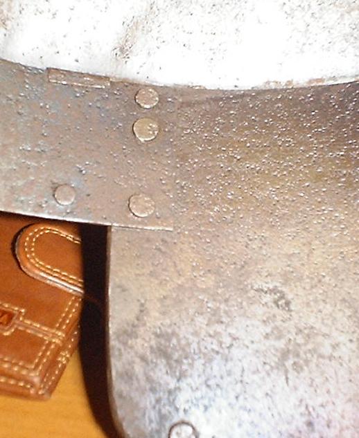 Osservando con attenzione l'immagine per cogliere differene costruttive. Oltre alle già* accennate, relative alla brunitura, ossidazione, chiodatura. Rispetto a quello in mio possesso, noto che la curvatura in basso della corazza è molto più ampia e larga. Provo a spiegarmi meglio: la linea della corazza normale al piano d'appoggio arriva fino a circa 1,5 cm dal piano e da questo punto inizia la curvatura; in questo di K la curvatura inizia molto più in alto (almeno a 4-5 cm dal piano d'appoggio.