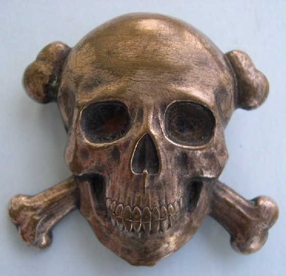 riguardo il secondo teschio, quello con la "sciabola", mi spiace dirvi che è una replica abbastanza conosciuta "made in usa" in acciaio brunito ed è leggermente più piccolo di quello classico in zama!