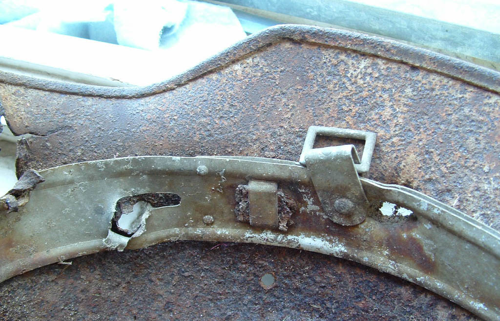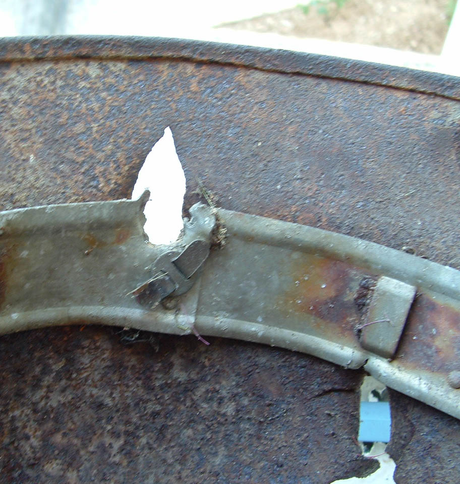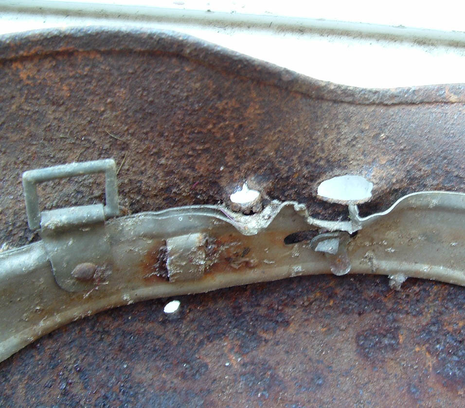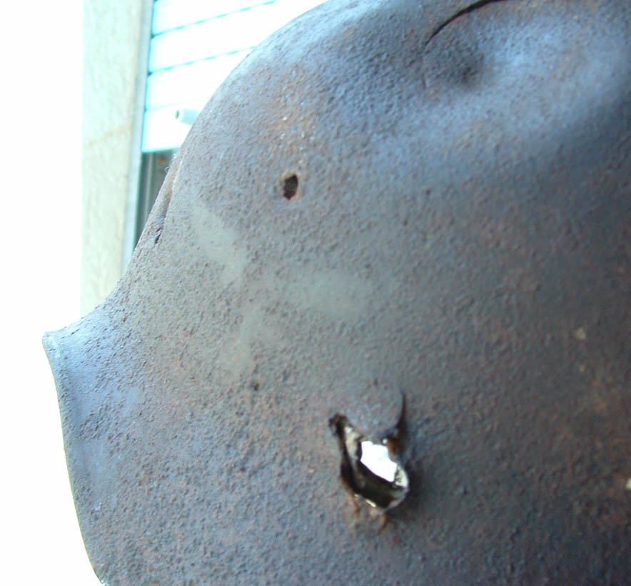Difficile capire la possibile situazione, forse un soldato già* colpito e sdraiato sulla schiena e "finito" magari con un arma di piccolo calibro (pistola?) che non ha forato l'acciaio.