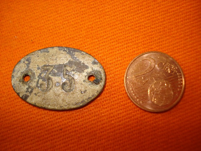 Anche io ho rinvenuto una targhetta del genere, mi pare che ci siano solo tre numeri, senza lettere, se riesco a ricordare dove è finita questa sera faccio una foto e la posto, mi pare ( ma probabilmente mi sbaglio ) che ci sia il numero 175.