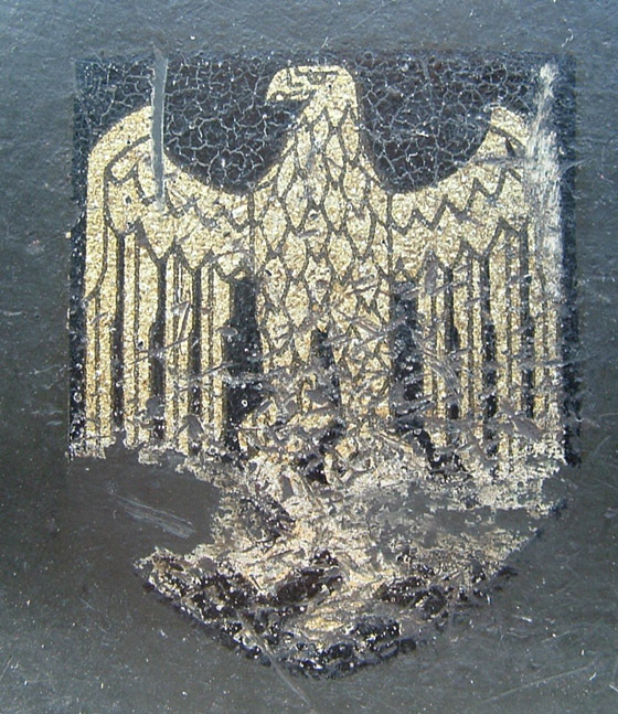 l'usura di questa decal nella parte centrale è corretta; ogni segno ha portato via anche un pò di vernice, quindi il ferro dell'elmo si è arrugginito in quei punti proprio dove la vernice è saltata
