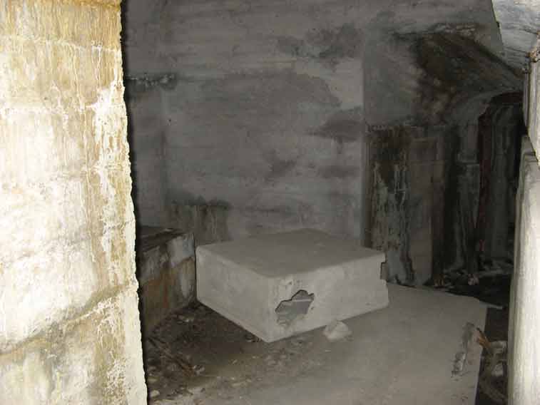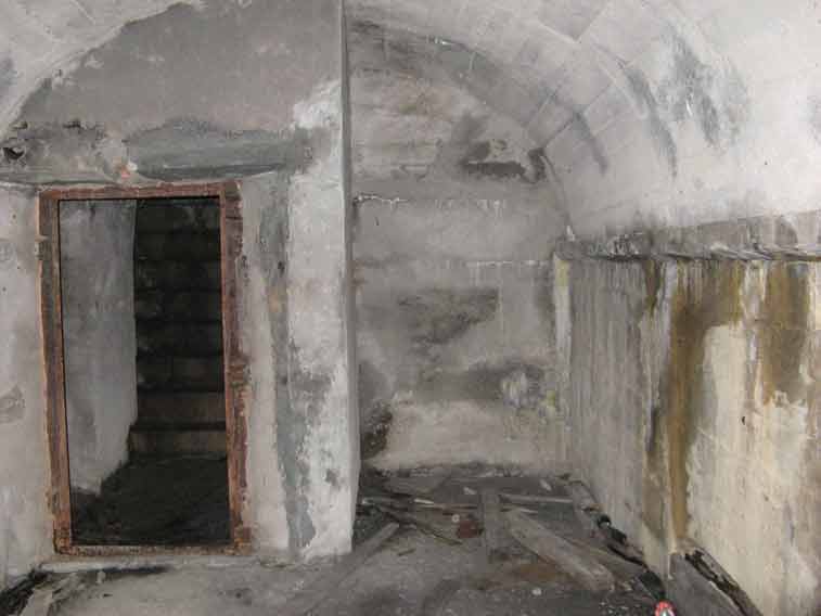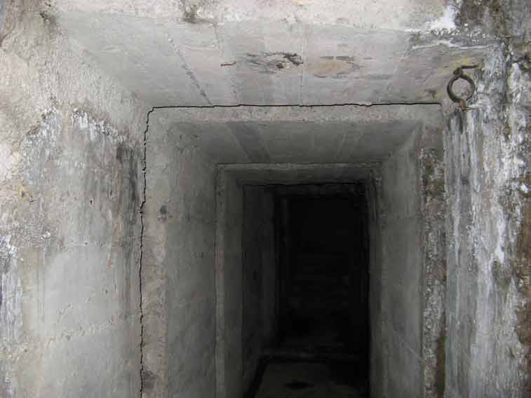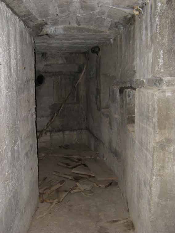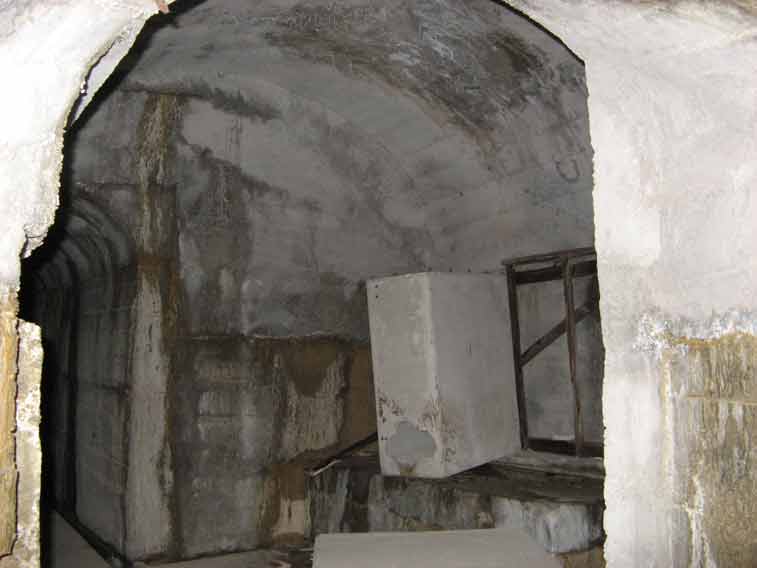 Appena entrati a fianco della porta sono posizionati i due condotti murati, che avrebbero dovuto contenere i tubi delle fotofoniche,proseguendo nel cunicolo ora non più rivestito,dopo aver superato 4 gradini giungiamo al locale del gruppo elettrogeno con ancora in sede i basamenti del motore,degli accumulatori e la vasca del serbatoio del carburante.