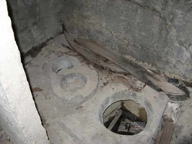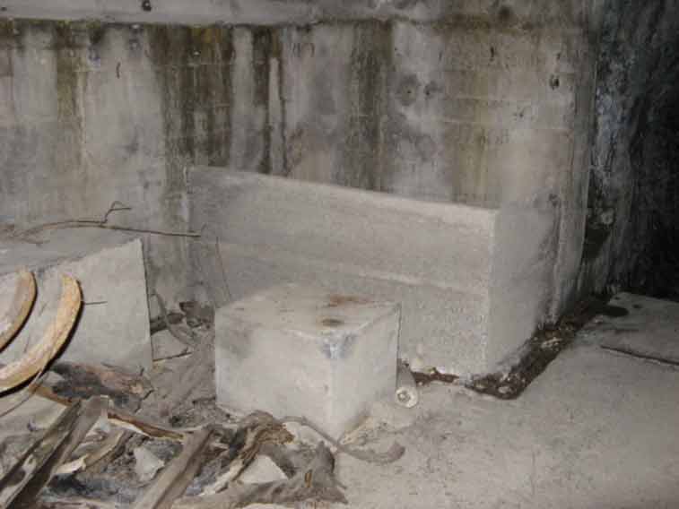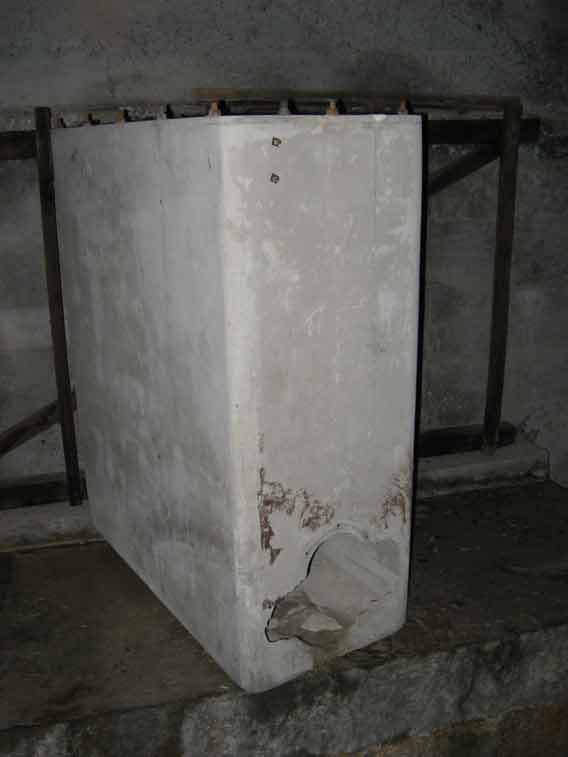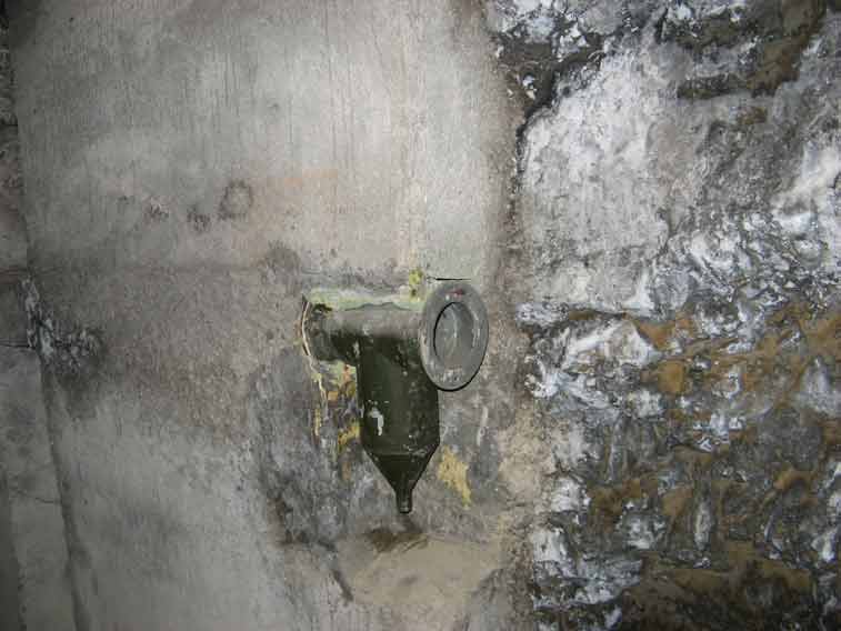 A questo punto il cunicolo piega decisamente a sinistra di circa 90° e superati altri 2 gradini si immette nel locale destinato a contenere la riserva d`acqua.Sono ancora presenti due serbatoi in eternit e il basamento che li sosteneva.