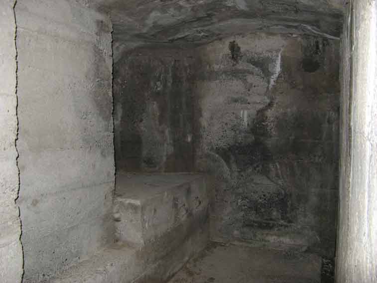 Si prosegue nel cunicolo(ora rivestito) e ci si immette nel locale ricovero(il più grande del Centro) destinato ad ospitare il presidio.Dopo un tratto rettilineo si diparte alla nostra sinistra il cunicolo che conduca all`ingresso attivo,a questo punto il camerone dopo aver superato un ulteriore gradino piega leggermente a destra per terminare all`inizio del corridoio della postazione dell`arma A1,posizionato a sinistra,mentre a destra è ubicato il piccolo locale destinato contenere l`impianto di ventilazione.Percorriamo quindi il tragitto fino alla casamatta dell`arma A1,scavata nella roccia e priva della piastra di protezione frontale.Subito prima della casamatta è posizionato a sinistra il vano della riservetta munizioni.