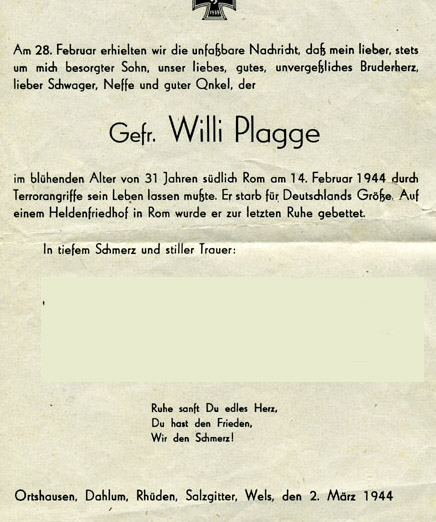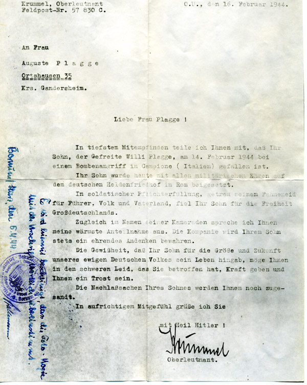 "L`Hauptfeldwebel Erich Plagge il Gefreite W. Plagge si incontrano inaspettatamente al Fronte in Sud Italia. I due fratelli non si vedevano da due anni e mezzo. La gioia di vedersi di nuovo l`uno con l`altro e estremamente grande.