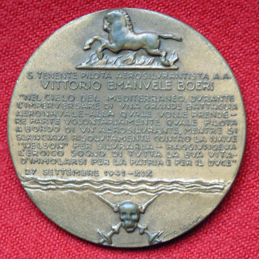 In linea con l'argomento trattato, vi propongo l'immagine di una medaglia commemorativa dedicata al sacrificio del Moschettiere del Duce Rino BOERI, caduto il 27 settembre 1941 partecipando alla grande battaglia aereo navale nel corso della quale venne silurata e gravemente danneggiata la nave inglese "NELSON".