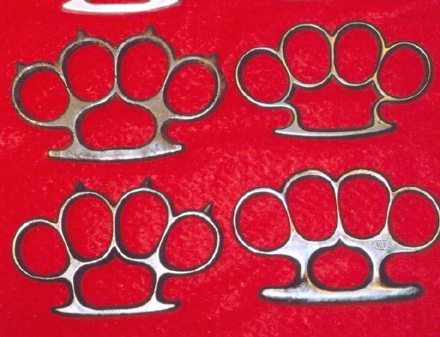 allego la foto di 4 tirapugni della mia collezione.Il più interessante è quello in basso a destra che è di produzione francese ed oltre ad essere molto ben rifinito,è più spesso dei consueti modelli e riporta i marchi di fabbrica del costruttore.
