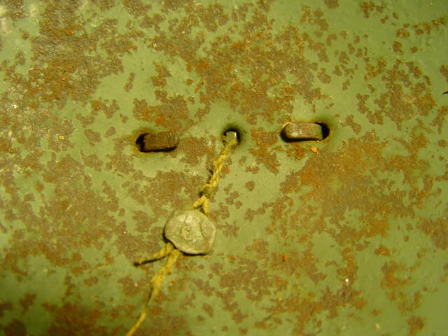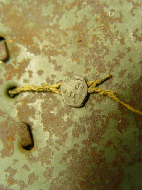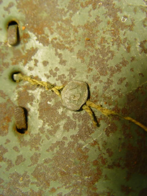 Io ti scrivo per un'altra cosa , nel mio elmetto , attraverso il buco centrale , pende un filo con un piombino attaccato. Ho fatto le foto dei particolari Su un lato del piombino sembrerebbe un logo , mentre sull'altro forse la scritta " LOTTO ". Sicuramente ne saprai piu' di me .