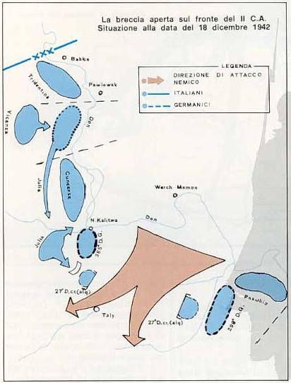 Questo dopo eroici tentativi di resistenza sul posto imposti dai comandi tedeschi causò il disordinato ripiegamento del blocco sud dell'Armir, aprendo una immensa falla nelle linee. La Julia fu spostata nella zona di Novo Kalitva (dove fondamentali erano tre punti: la Quota Pisello, la Quota Signal e il quadrivio di Selenij Jar), ma la frittata era già* stata fatta.