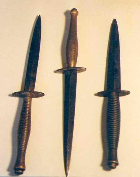 Mi sembra che nessuno abbia ancora postato la fedele arma da taglio delle truppe speciali inglesi e non solo, durante la II GM.I coltelli da combattimento Fairbairn and Sykes, dal nome dei due inventori, furono al fianco non solo dei Commandos inglesi, dei parā* britannici, degli uomini della SAS, ma anche dei marines americani, dei Rangers ecc. ecc. Questi primi tre, da una foto piuttosto vecchia, sono:
