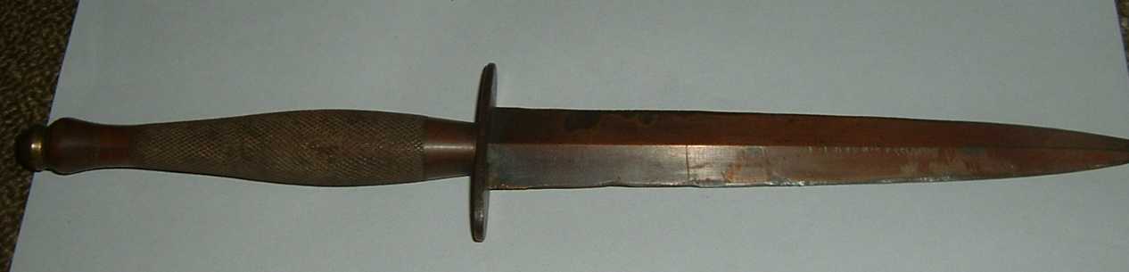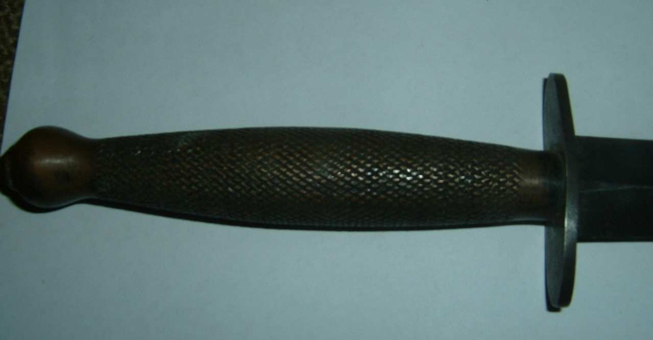 Segue un modello 2nd pattern, in rame rossastro (?) con stampato nell'impugnatura un simbolo araldico, forse un leone rampante,in uno scudo. Sono noti pugnali simili con la croce di Lorena, distribuiti alle forze della Francia Libera, questo potrebbe essere un modello per le truppe belghe o cecoslovacche?