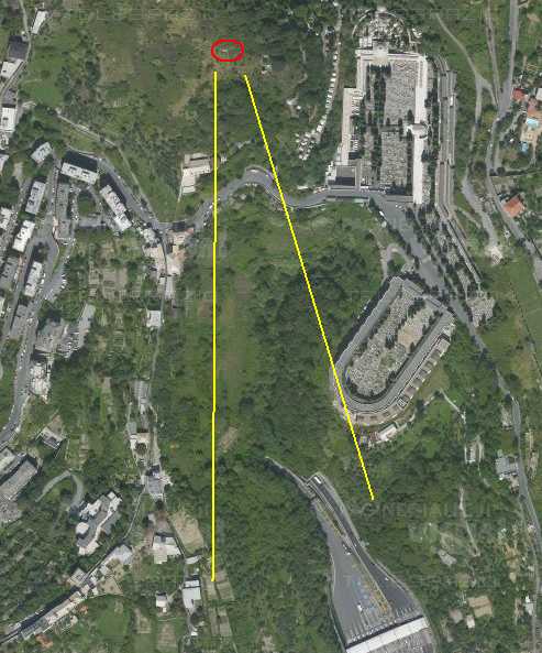 in alto il circolo rosso inquadra il bunker mentre le due righe gialle indicano + o - il campo che avrebbe potuto coprire .