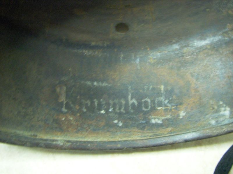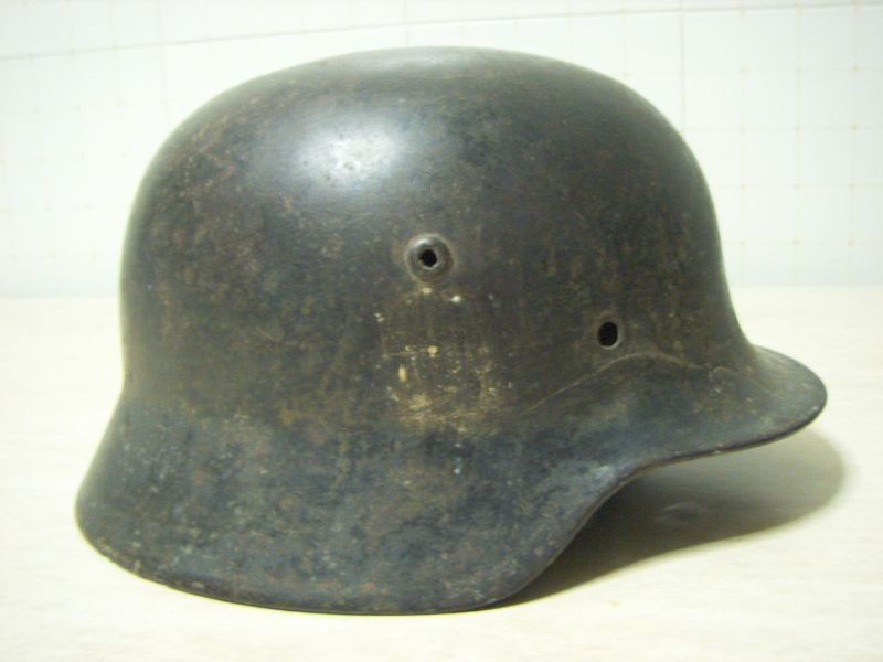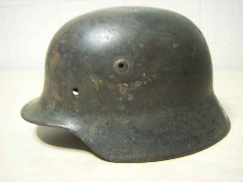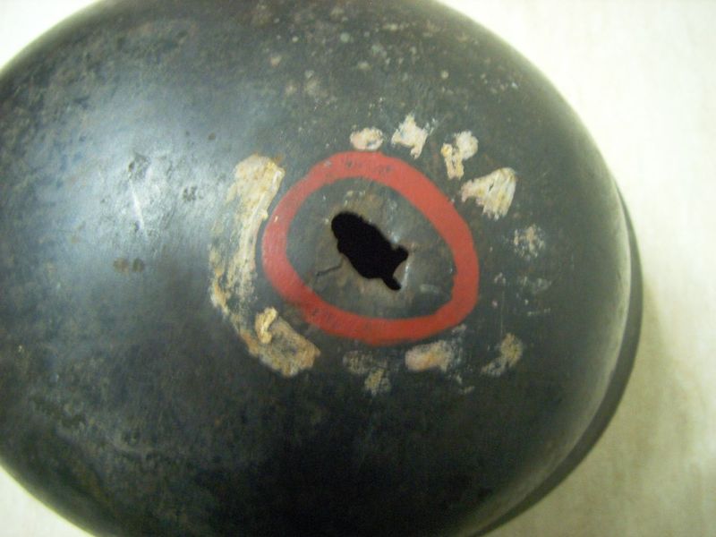 Adesso vado a postare un M35 LW che ha ricevuto un colpo proprio sulla calotta.Il cecchino aveva marchiato la sua opera cerchiando di rosso il foro e scrivendo il proprio nome in bianco(che con il tempo è diventato illeggibile).Sulla falda posteriore si legge il cognome del proprietario(appartenente ad un'unità* terrestre della LW e sepolto a Pomezia).