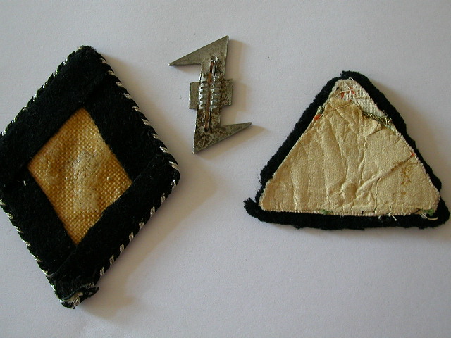 - braccio destro, fregio romboidale con rune SS profilato in cordoncino bianco/nero per la truppa/s.uff. e argento per gli Ufficiali. .(di questo fregio esiste anche una versione fiamminga con rune lunghe, che venne utilizzata in parte anche dagli Olandesi).