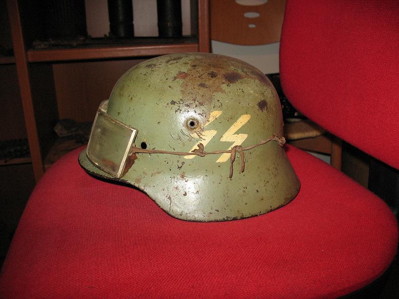 l'elmo secondo il mio modestissimo parere (almeno all'esterno) non ha vernice originale, č stato riverniciato chissā* quando e chissā* da chi, costui ha quindi aggiunto (a pennello)[II][II] le rune, che sono il simbolo delle SS