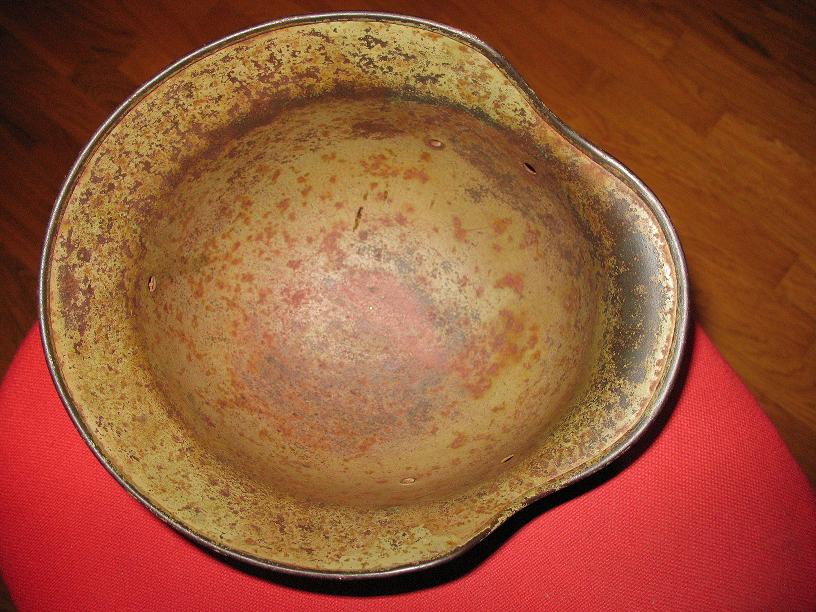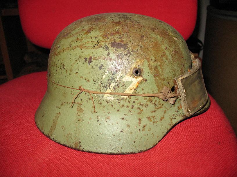 salve ,vi propongo qui un elmetto di cattura da parte di mio nonno e un suo copmagno durante la 2ww nei balcani. credo si tratti di un elmo delle ss, non so se la verniciatura e originale o rifatta il fatto sta che l'anno preso a un tedesco in queste condizioni, ci sono ancora i segni della scia di sangue. vi posto delle foto