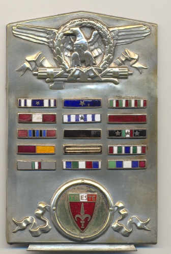 Invio la foto di una placchetta di 7,5 x 11 cm con applicati i nastrini a smalto corrispondenti alle medaglie guadagnate dall'originale propietario.Come si vede dalle attribuzioni il propietario doveva essere un valoroso.Chiedo il vostro aiuto per identificare il nastrino nella fila centrale sopra quello nero e i due sotto lo stesso.Secondo voi il fregio della citta di Trieste cosa potrebbe indicare?Semplicemente la citadinanza o l'appartenenza alla legione MVSN di quella zona?