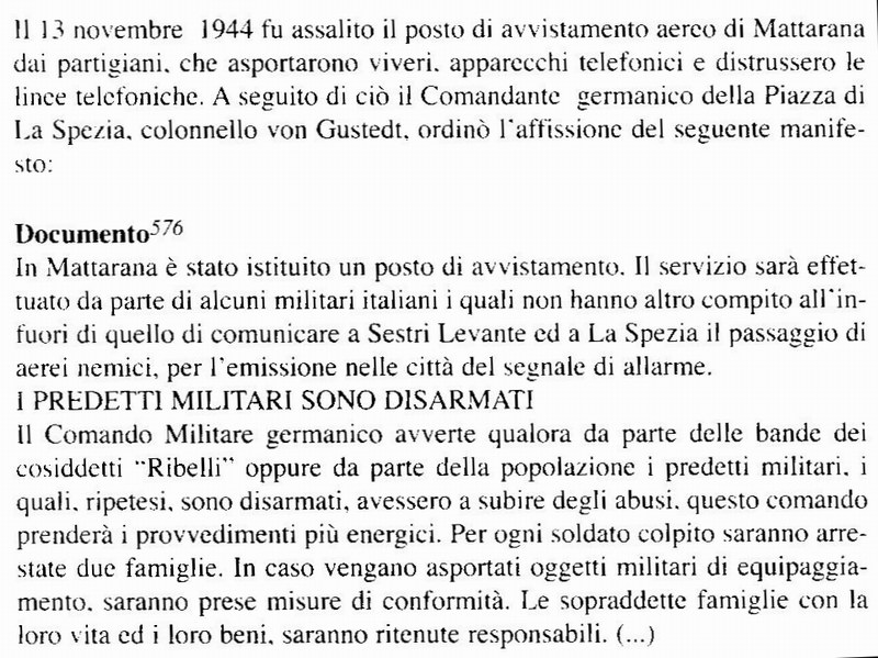 Il tentativo di scoraggiare attacchi a posti di avvistamento è ben rappresentato dal testo di un manifesto fatto affiggere il 10.11.44 a Mattarana (sulla via Aurelia, direzione Genova, zona Bracco vedi post; http://www.milistory.net/forumtopic.asp? ... ms=,Bracco)
