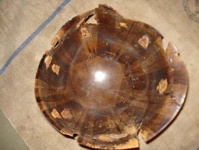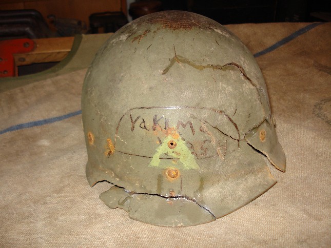 Sul liner è inciso un nome Yakima Wash e poi successivamente è stato disegnato il pino della 91 esima, il liner è molto rovinato e ho dovuto incollare i vari frammenti, lo conservo solo perchè c'è inciso quel nome e perchè c'è il pino. Nella stessa buca trovai un fodero di baionetta USA, fodero e baionetta Tedesca, dei caricatori del Garand, scatolame vario