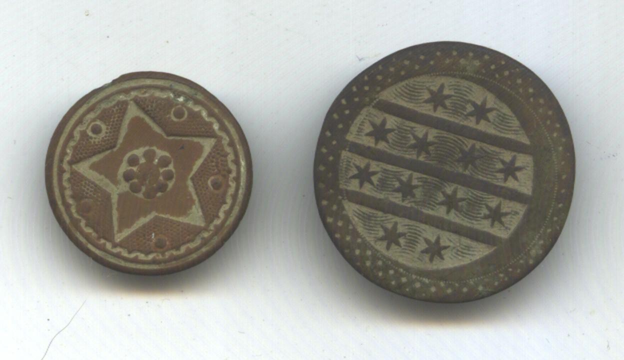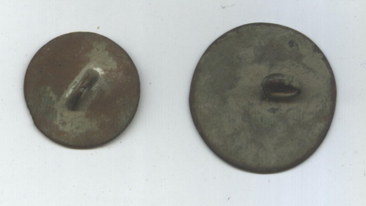Si tratta di due bottoni in lega di rame ad uso civile ("universali" se ne ritrova in tutta Europa, comunissimo quello con la stella) databili tra la fine del '700 e i primi decenni dell'800. Capita di trovarli anche in contesti militari dato che le truppe di quel periodo spessissimo mal fornite e male equipaggiate indossavano indumenti civili (gilè soprattutto)