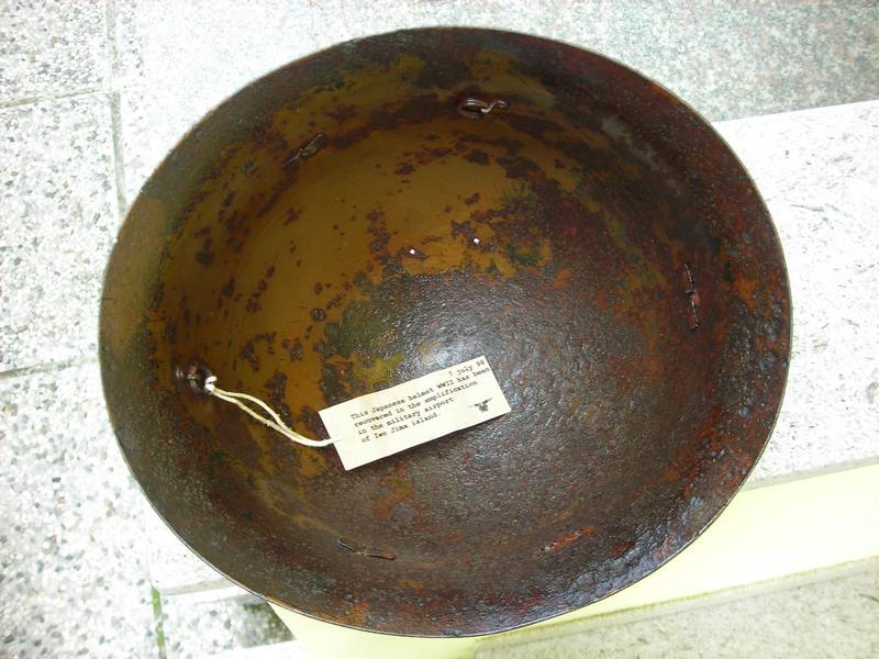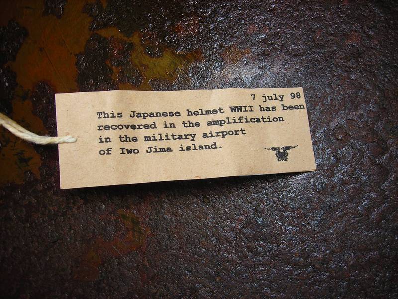 Questo cartellino datato 7 luglio 98 dice che l'elmetto è stato ritrovato durante dei lavori nell'aeroporto dell'isola di Iwo Jima.
