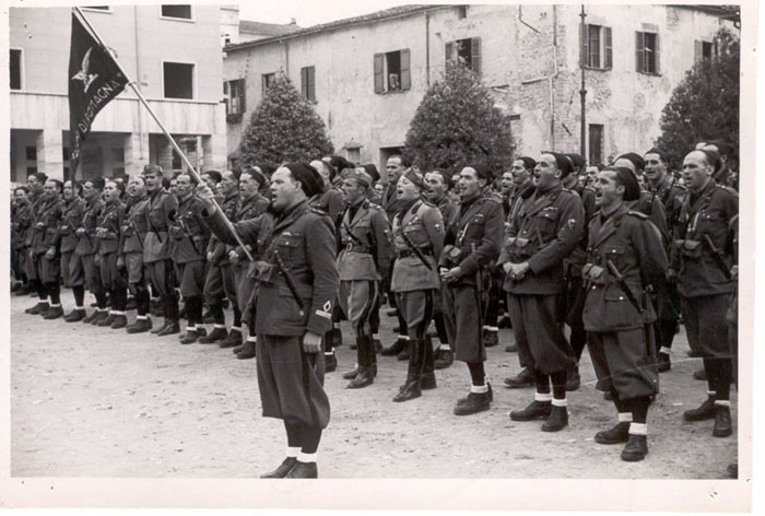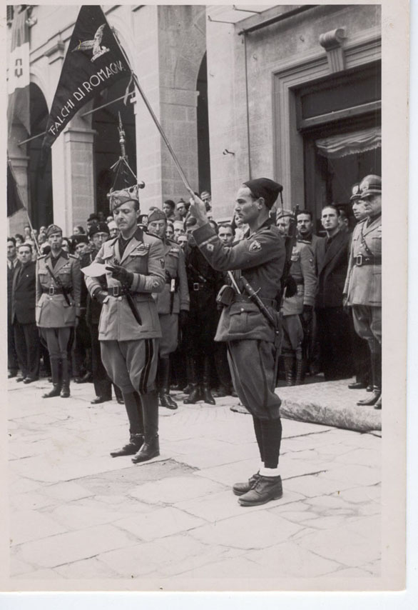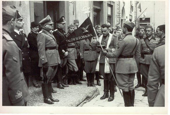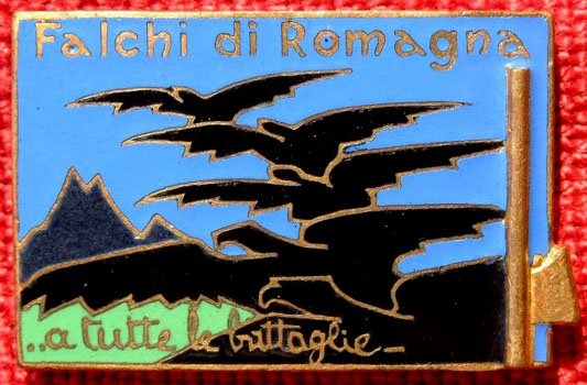 I canoni per la classificazione di questo distintivo tra quelli della Milizia Volontaria per la Sicurezza Nazionale ci sono tutti: grafica, tipologia, dimensioni, motto. La cosa che però mi è mancata a lungo è stata la totale assenza di fonti che indicassero una collocazione geografica precisa a questi "rapaci" in camicia nera. La MVSN in Romagna era rappresentata dalla 71a Legione "Manfreda" di Faenza, dalla 81a Legione "Alberico da Barbiano" di Ravenna e dalla 82a Legione "Benito Mussolini" di Forlì. Chiaramente, se il distintivo fosse stato commissionato da una Legione della Milizia, avrebbe se non altro riportato il numero attribuitole e mancando tale indicazione si poteva ulteriormente orientare la ricerca verso un Battaglione; ma quale? Gli amici romagnoli interpellati hanno solo confermato di conoscere il distintivo ma di non avere documentazione che possa risalire ai Falchi di Romagna. L`arcano è stato svelato dal mio carissimo amico e grande collezionista V.D.G.al quale appartengono le fotografie che corredano questo racconto. Immagini splendide, nitide, al punto tale che, per esempio, si distingue il numero della zona CC.NN presente sullo scudetto dell`alfiere (IV zona), oppure la particolarità* della fiamma di combattimento, dei pugnali, degli attributi uniformologici ... ma, cosa più importante, il numero 71 applicato sul fregio cucito sulla bustina del Primo Seniore (presumibilmente il Com.te del Battaglione). Siamo quindi a Faenza e seppure la circostanza in cui sono state scattate le foto non sia nota, di certo la presenza di un cappellano militare e del Generale RUSSO, Capo di Stato Maggiore della Milizia, fanno pensare ad una cerimonia di una certa rilevanza, forse la benedizione della fiamma di combattimento prima della partenza del reparto per la zona di guerra. Unica indicazione ci viene fornita dal retro delle fotografie dove è stato annotato l`anno 1939. Per quanto attiene al distintivo, è stato prodotto in metallo dorato e smalti e presenta posteriormente una spilla fissata orizzontalmente, al di sotto della quale, in rilievo sul metallo, compare l`indicazione del fabbricante " EDIZ. D`ARTE V.E. BOERI ROMA" ; conosco tuttavia un collezionista che ne possiede un esemplare non firmato, particolare riscontrato anche su altri distintivi.