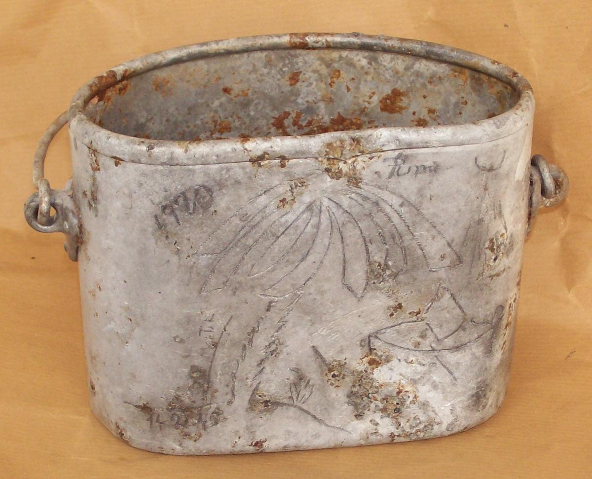 Oggi mi sono dedicato a ripulire questa gavetta, nonostante sia un pezzo comune, sul retro c'è la dedica del soldato , incisa a punta di baionetta durante una pausa, alla ragazza amata, "Rina" visible in alto dx, in basso a sx si legge la data del disegno "14.02.1945" ed in alto a sx "1920" forse la classe.