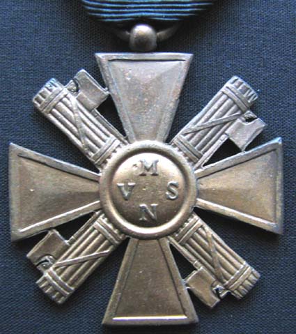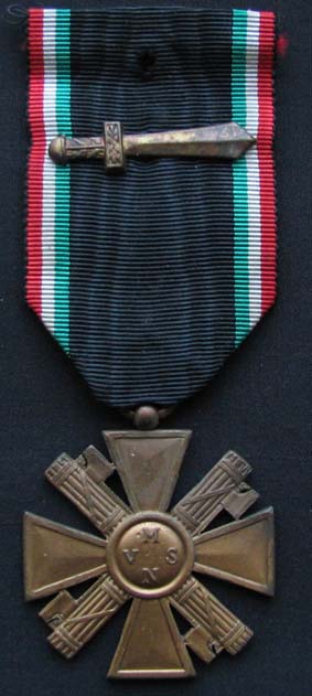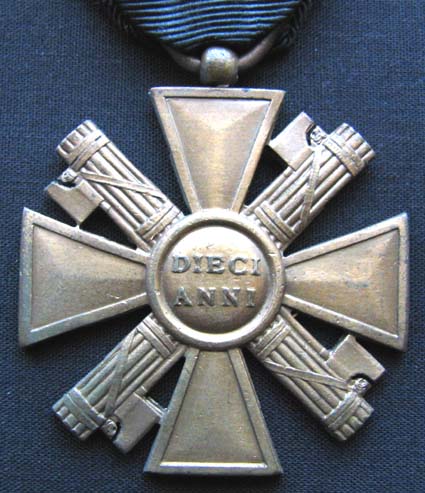 Questa Croce fu' istituita nel 1933 per contrassegnare coloro che prestarono 10 anni di servizio nella MVSN. Fu' coniata in bronzo ed in unico grado. Contemporaneamente ad essa, venne istituita una fascetta, formata da due pugnali incrociati, per i decorati che abbiano servito almeno 5 anni in un battaglione CC.NN. Successivamente, nel 1938, fu' introdotta una fascetta in bronzo a forma di gladio romano per chi avesse prestato servizio in A.O.I. (tale periodo raddoppiava il conteggio ai fini del computo). Nel 1943 fu' introdotta una nuova fascetta, identica alla precedente ma colorata in rosso per distinguere coloro che prestarono 20 anni di servizio. Gli esemplari ufficiali, coniati dalla ditta Lorioli di Milano avevana l'attacco alla Croce di forma rettangolare, con l'anello di sospensione triangolare. Esistono comunque varianti con l'attacco sferico e l'anello circolare. (testo tratto da "Le medaglie Italiane negli ultimi 200 anni" del Brambilla).