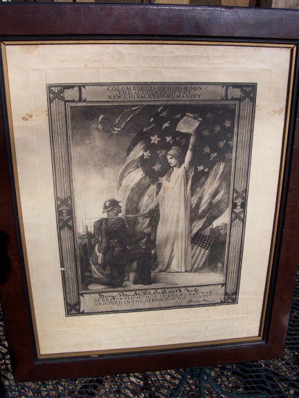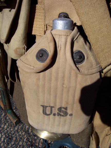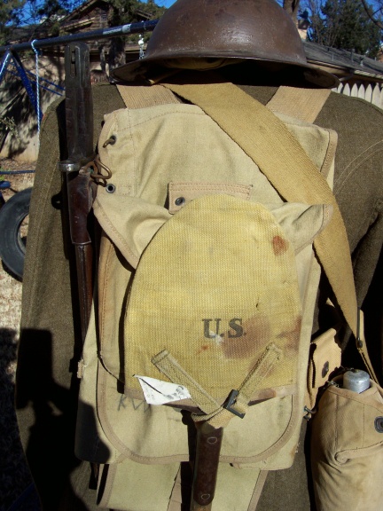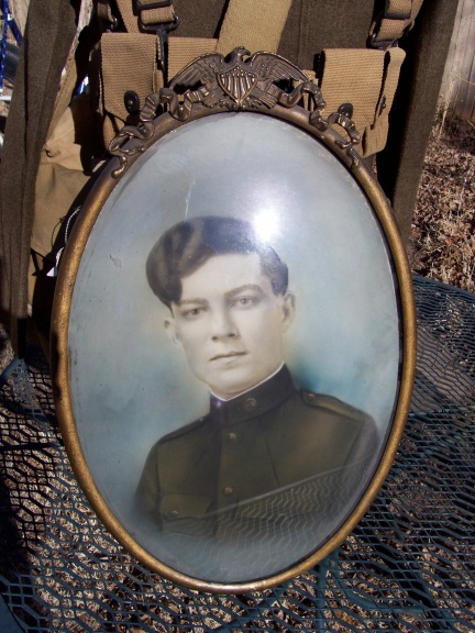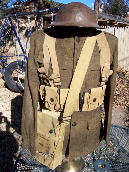This uniform and picture are of a WWI US doughboy of the Texas-Oklahoma Division during WWI.  I have many of his items, but will post a little today.  The equipment and helmet were not his, but are WWI and of the type he would have worn at the time.  The large framed certificate is what the wounded or killed Doughboy would have received instead of the Purple Heart at this time.  The Purple Heart was instituted after WWI.  Many people do not understand the full importance of these certificates and are very cheap at this time when you find them on ebay.  Buy them!  There is also an early bayonet for the 03 Springfield with early leather scabbard.  Very hard to find the leather scabbard here.  All of the gear is WWI, but the wound pouch if of a starnge design.  Perhaps a production oddity?  I don't know.  Oh, the man's last name was Brennan.