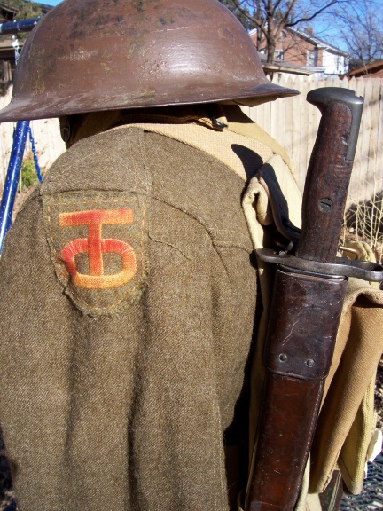 non potrei trovare uno spazio per le uniformi alleate nella zona di WWI, in modo da invierò qui? I moderatori, spostano prego questo se ho disposto questo nella zona errata. Queste uniforme ed immagine sono di un WWI Stati Uniti doughboy della divisione dell'Texas-Oklahoma durante il WWI. Ho molti dei suoi articoli, ma invierò poco oggi. L'apparecchiatura ed il casco non erano sua, ma sono WWI e del tipo avrebbe portato allora. Il grande certificato incorniciato è che cosa il Doughboy ferrito o ucciso avrebbe ricevuto anziché il cuore viola attualmente. Il cuore viola è stato istituito dopo WWI. Molta gente non capisce l'importanza completa di questi certificati ed è molto poco costosa attualmente in cui li trovate su ebay. Comprilo! Ci è inoltre una baionetta in anticipo per i 03 Springfield con lo scabbard di cuoio in anticipo. Molto duro trovare lo scabbard di cuoio qui. Tutto l'ingranaggio è WWI, ma il sacchetto della ferita se di un disegno dello starnge. Forse una singolarità* di produzione? Non so.  L'OH, l'ultimo nome dell'uomo era Brennan.
