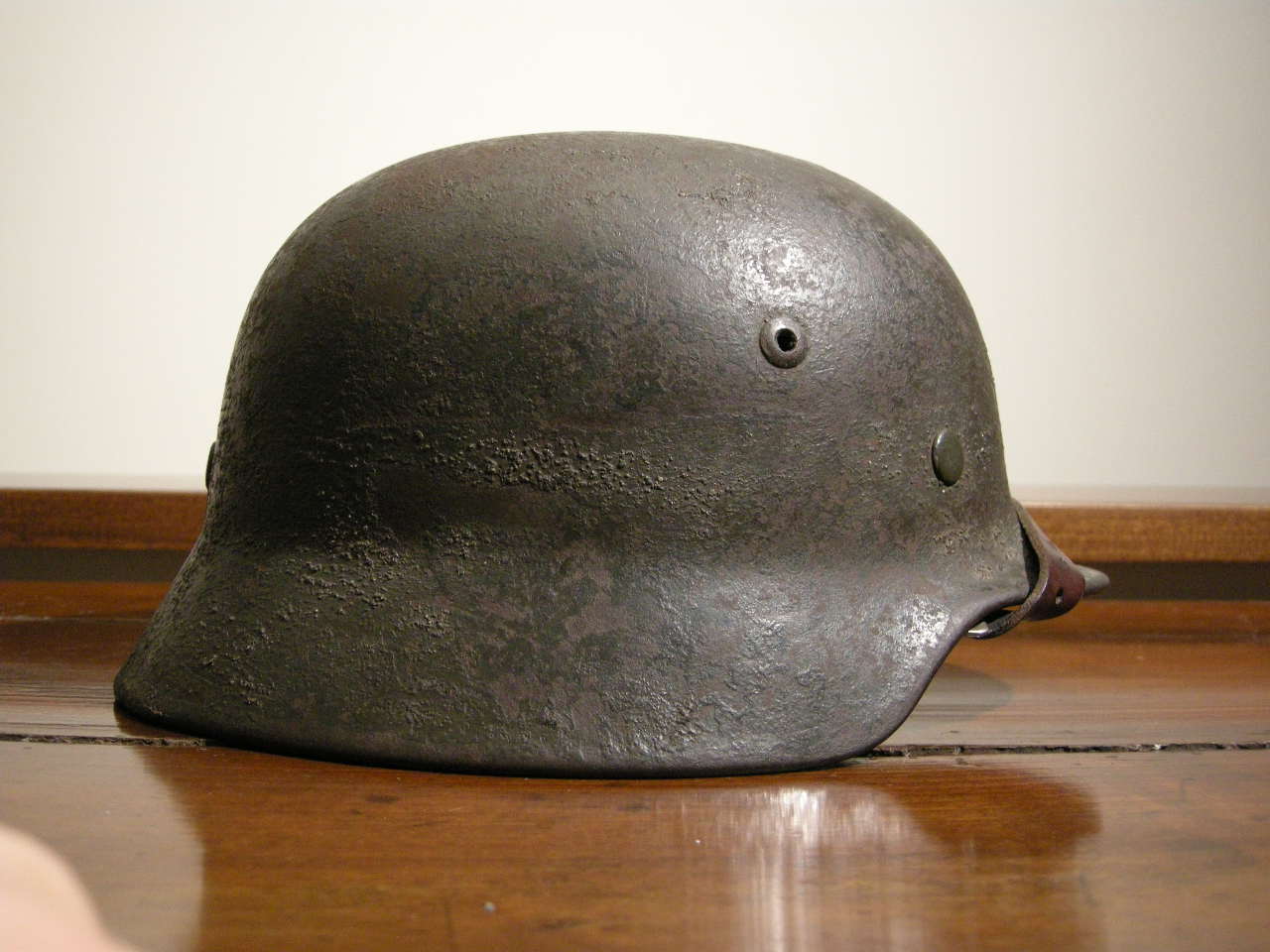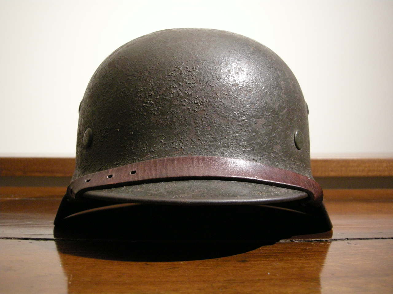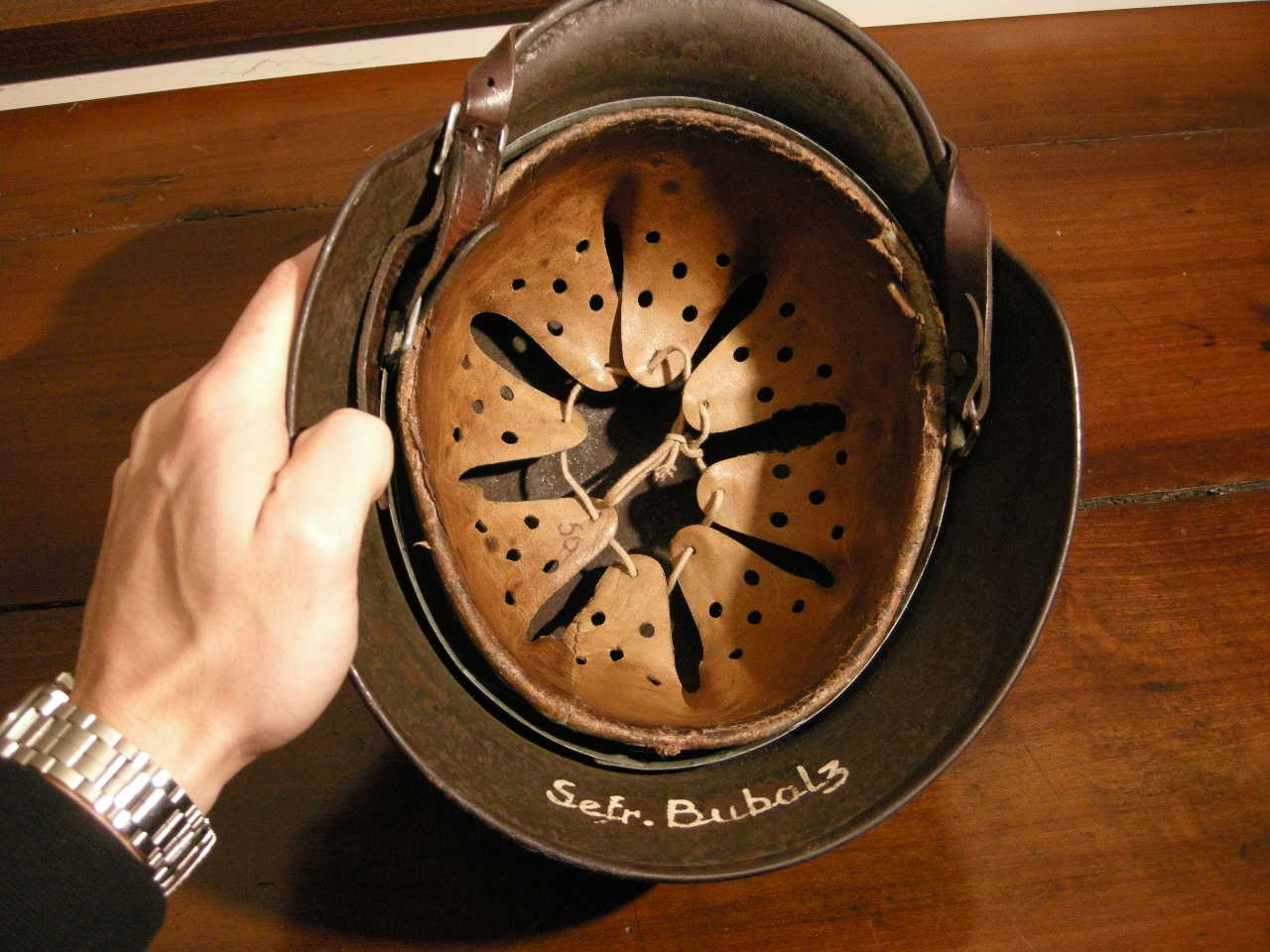 vi presento il mio primo regalo un m35 wh.l ho comprato da un collezionista di cui mi fido.probabilmente e' appartenuto a due soldati dato che sotto il nome il metallo e' stato grattato(cosa fatta a suo tempo)e sotto la decale nella parte superiore sotto quello che e' rimasto della testa dell' aquila si vede la punta di un becco d' orata forse era un krieg?!all'interno dell'imbottitura vi e' un timbro con su scritto b57i44 non riesco a capire chi sia il costruttore dato che ho poco spazio per vedere tra il cerchione e il guscio e non voglio forzare,con una torcia riesco comunque a intravedere dei marchi:a voi i commenti...