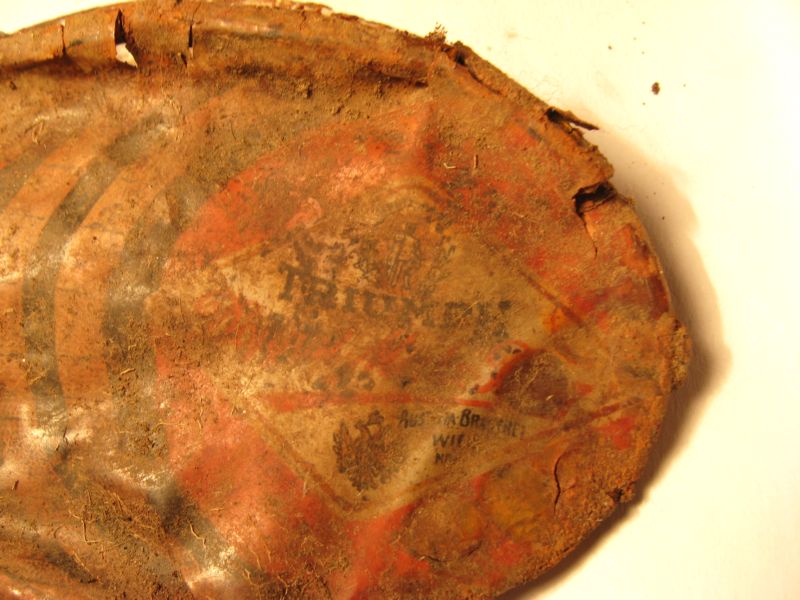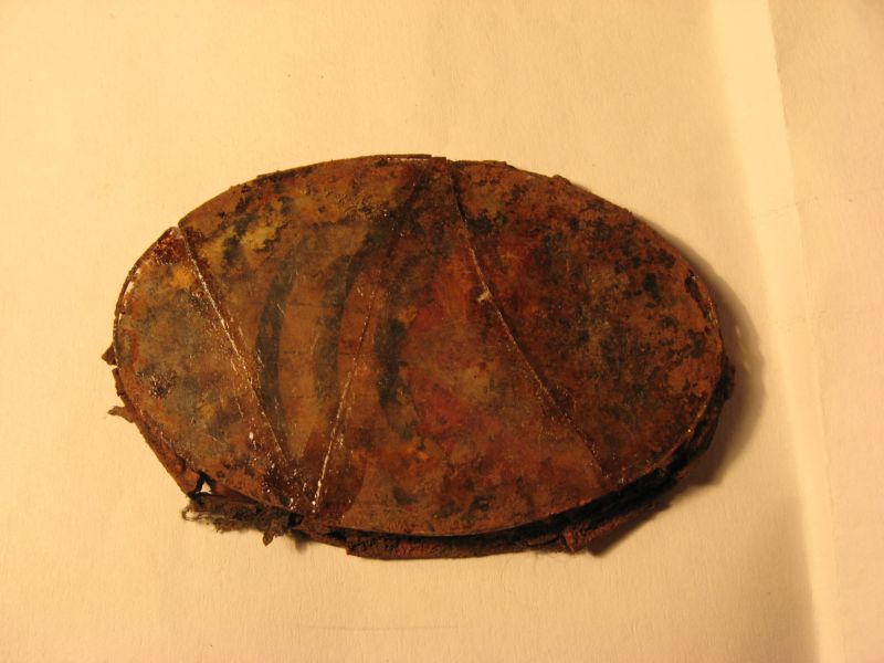 Si tratta di uno specchietto austriaco (6,5cm X 4cm)... pensate.. l'ho ritrovato, più o meno, a 40cm di profondità ... la parte in lamierino cui era fissato il vetro è completamente andato..(forse proprio perchè si è rotto)mentre, quasi miracolosamente, la carta è rimasta intatta..