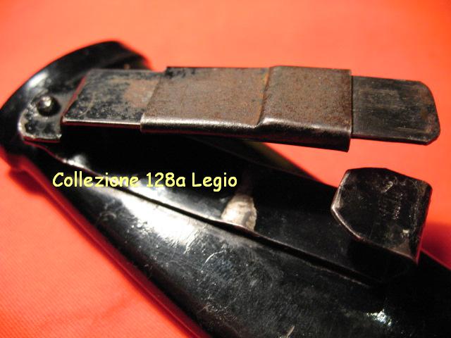 Anche il passante per il cinturone è cambiato;nel primo modello era realizzato con un lamierino fisso appositamente sagomato per posizionare il pugnale obliquamente,nel secondo modello è realizzato in modo da potersi aprire a compasso evitando di aprire il cinturone per togliere il pugnale.La forma è il sistema di chiusura è analogo a quello presente sui foderi dei pugnali per assaltatori del R.E.I.ma di dimensioni maggiori.