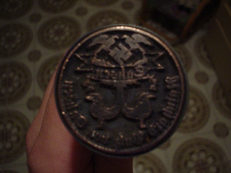 Ora che me lo fai notare anche a me non sembra un timbro, sembra tipo qualche strano schild, comunque una polaccata perchè il metallo e l'insieme, nonchè la provenienza, è quella...