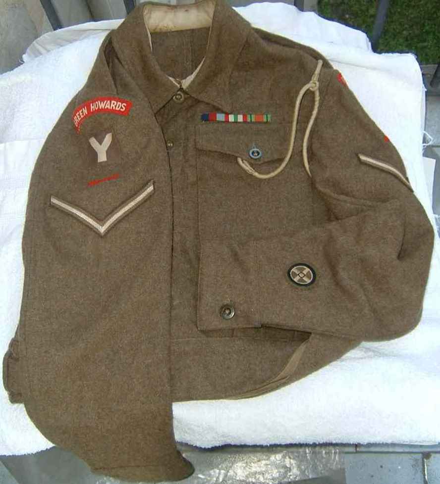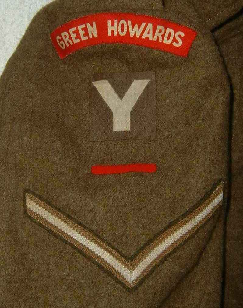 Ecco qui un BD che dovrebbe rendere felice D Day Dodger, per comprensibili motivi... porta le insegne di un Lance Corporal dei Green Howards (Alexandra, Princess of Wales's Own Yorkshire Regiment), per la precisione 1st Battalion, 15 Infantry Brigade, 5th Division. Il nostro Lance Corporal, con "skills" di autista (ma un fante a tutti gli effetti, dal momento che ha l'arm of service strip rosso) ha servito col battaglione "soltanto" in Italia, sbarcando in Sicilia, forzando il Sangro (1943)   e il Garigliano (1944), combattendo ad Anzio e partecipando alla liberazione di Roma, ma i suoi compagni più vecchi potevano essersi fatti persino la B.E.F. (1930-40).