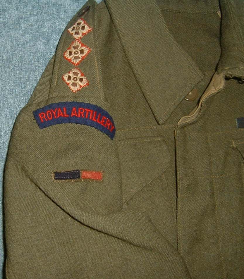 Dettaglio delle insegne da spalla. Oltre al title Royal Artillery anche lo Army of Service strip nei colori blu/rosso. Si noti che il Royal Engineers portavano l'Army of Service strip a colori invertiti, rosso/blu. Questo BD ha il collo chiuso da due gancetti con relativi occhielli di metallo, altri hanno un singolo gancio di dimensioni maggiorate, sempre in metallo.