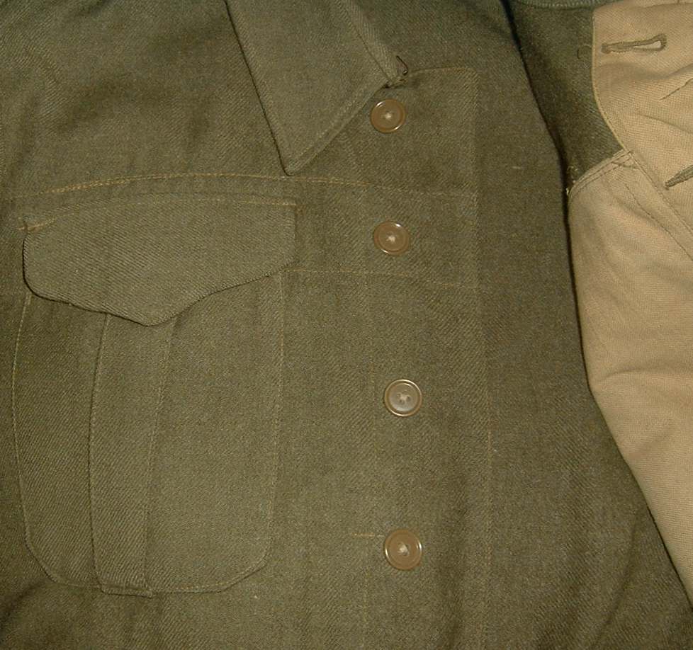 Dettaglio dei bottoni. In genere quelli australiani sono di metallo naturale, detto gun metal, questi invece sono di plastica, piatti, molto simili a quelli usati sulla M 43 americana.