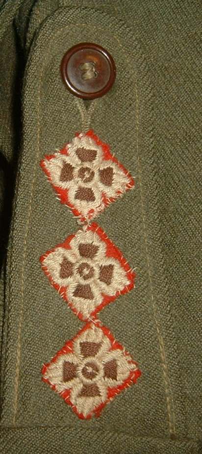 I tre pips da capitano, nel regolamentare colore rosso della fanteria e artiglieria.