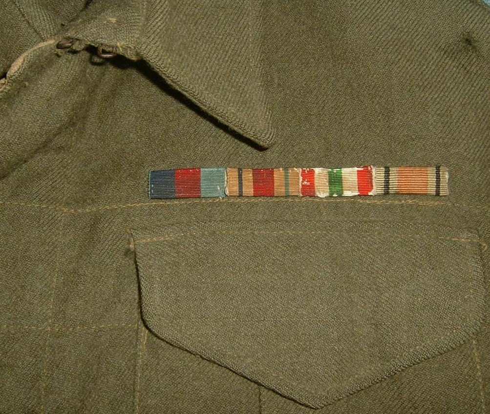 I nastrini delle medaglie: le consuete 1939-45 Star, Africa Star, Italy Star, Defence Medal.