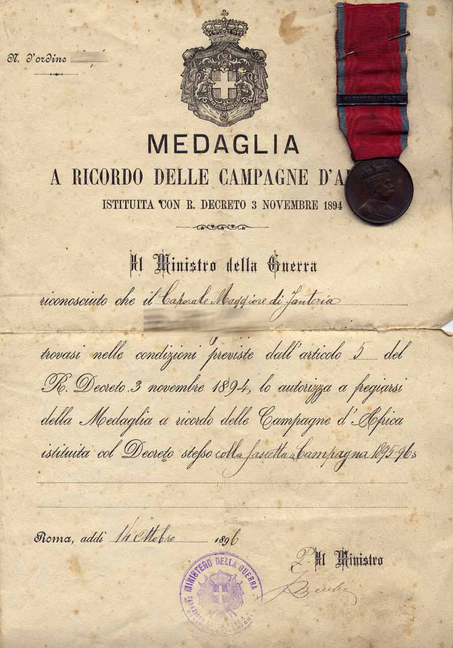 Rilasciata al soldato di fanteria Rogolotti Giovanni, per la campagna del 95-96, il 1 dicembre 1896 (così mi sembra di