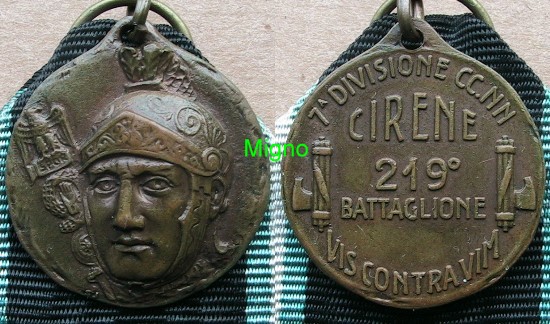 Io sono innamorato di questa medaglia del 219 battaglione della "Cirene". Rispetto alla altre, che solitamente sono delle discrete "padelle", questa è di dimensioni modeste, 25 mm ma ha una definizione che trovo squisita. Spero la foto renda.