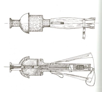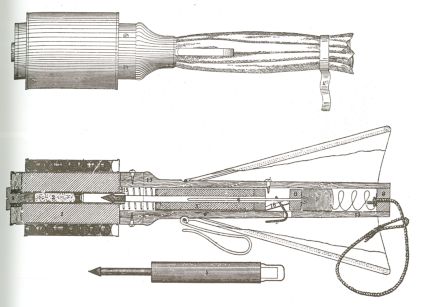 Il percussore era contenuto nella cavità* cilindrica del manico in legno tornito, e tenuto a distanza dalla capsula d'innesco mediante una molla a spirale tenuta ferma da una squadretta di fermo inserita attraverso una feritoia laterale nel legno..